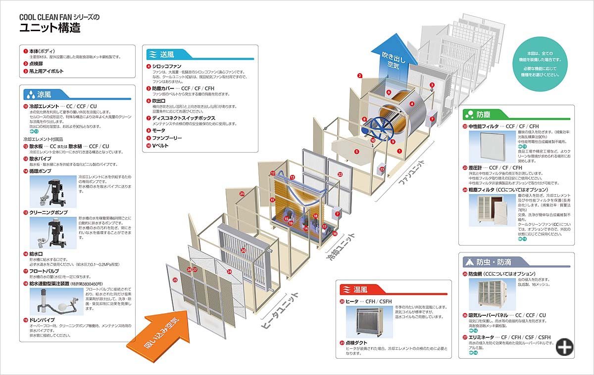 優れた給気能力を持つ、大風量低騒音のファンユニット。水の気化熱を利用し、夏季の暑い空気を涼風にする冷却エレメントを中心とした冷却ユニット。作業空間や各種施設における防寒対策に効果的なヒータユニット。用途に応じて空気を浄化するフィルタ・防虫網類。